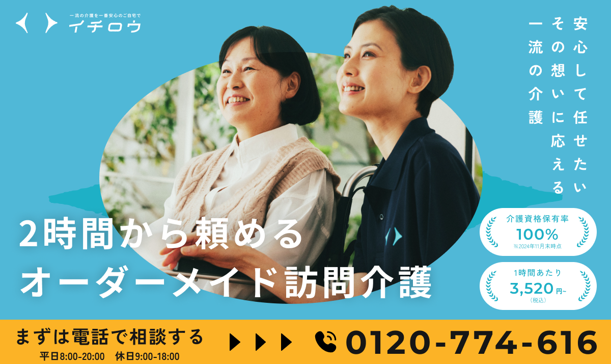 例えば、イチロウは介護保険では対応できない、あらゆる介護ニーズに応える民間の介護サービスです。イチロウは、採用率8%の厳しい条件をクリアした介護士が在籍します。介護保険では対応できない、あらゆる介護ニーズを24時間365日体制でサポートしています。外出同行や家事代行、重度の方の介護まで幅広く対応可能です。