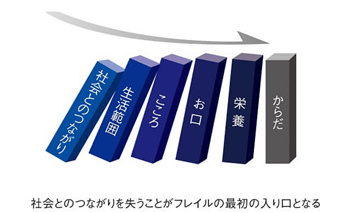 また、東京大学高齢社会総合研究機構の飯島勝矢教授が提唱する「フレイル・ドミノ」という概念も重要です。社会とのつながりが失われることがフレイルの最初の入り口となり、そこから生活範囲の縮小、心の健康の低下、口腔機能の衰え、栄養状態の悪化、身体機能の低下へとドミノ倒しのように進行していきます。このことから、社会参加の維持が予防の第一歩となることがわかります。