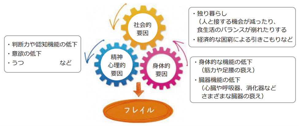 フレイルに陥る原因は単一ではなく、加齢、慢性疾患、低栄養、活動量の低下など、さまざまな要因が複合的に絡み合っています。これらの要因が相互に作用することで、健康状態の悪化が加速していきます。