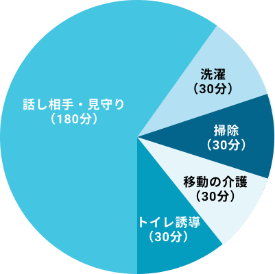 - 日中の見守り介護・お話し相手ベッドからの転倒や、点滴等の離脱などのリスクを最小限にするためにご利用者様の見守りを行います。また日中のお話し相手もさせていただきます。