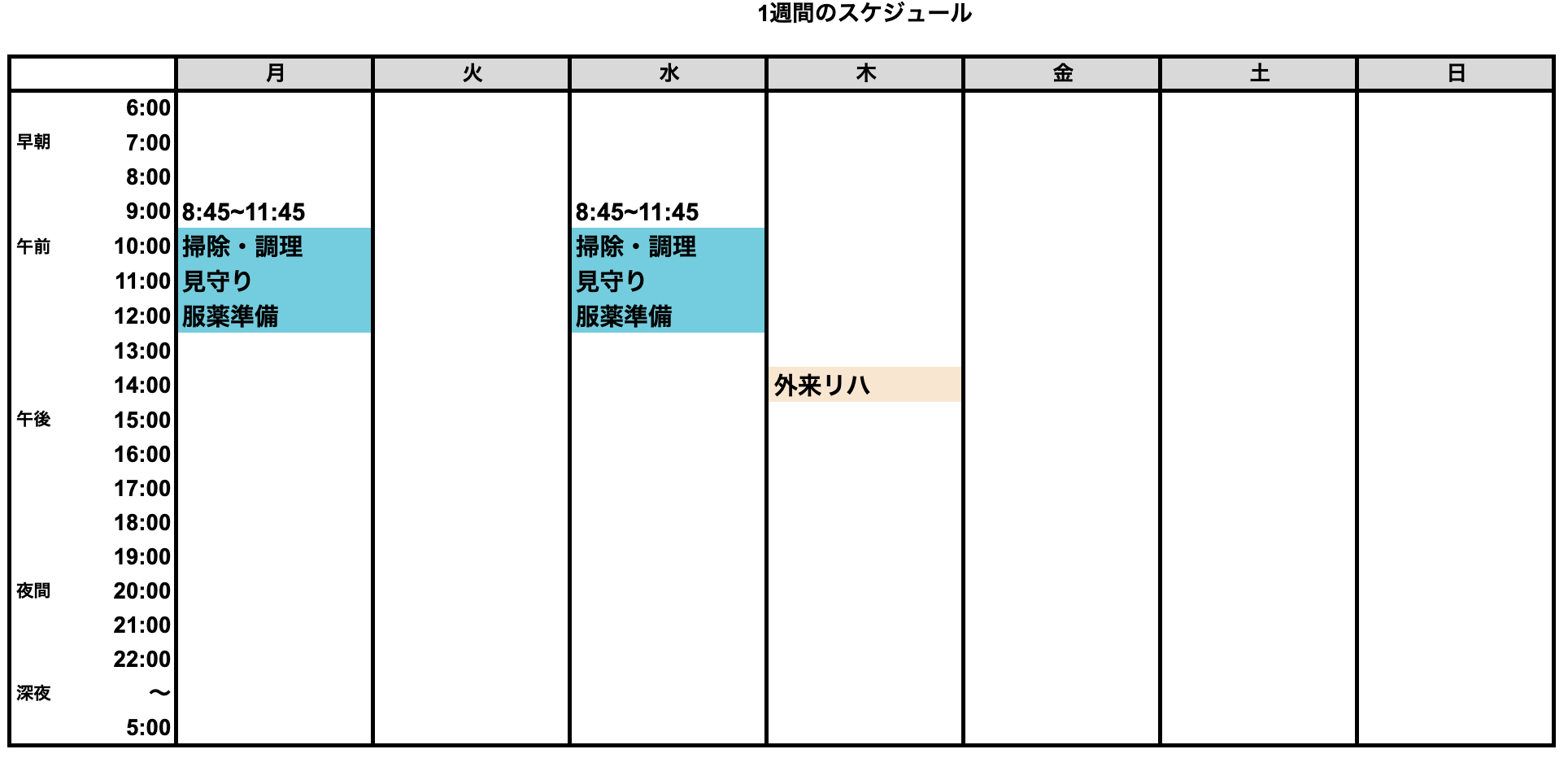 ・掃除 埃取り、バス、トイレ、キッチン清掃 キッチンの詰まりの掃除 ・調理 昼食準備、朝の食器片付け ・その他 お身体の状態により、移動の見守り ゴミ出しなど