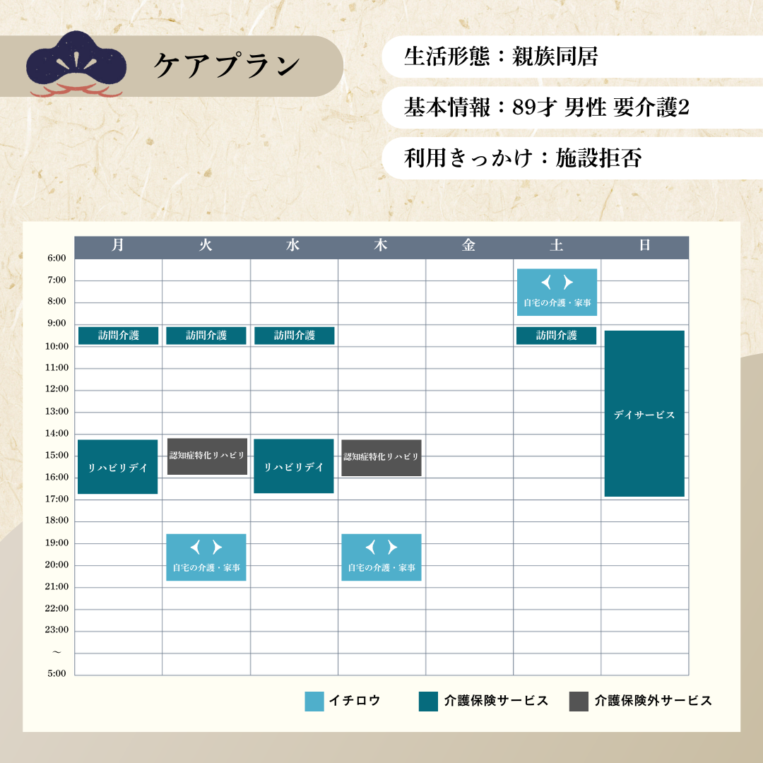 毎月11日〜翌月10日の勤務シフトが決まった時点で、イチロウに依頼をまとめて出します。福祉用具も布団から電動ベッドに変更。父は脳梗塞後に認知症があり、食事すら分からなくなることも。安全に介助するにはプロの手が欠かせません。金曜の午後など父だけになる時間帯は、できるだけシフトの休みを当てつつ、他の曜日はイチロウで穴を埋めています。